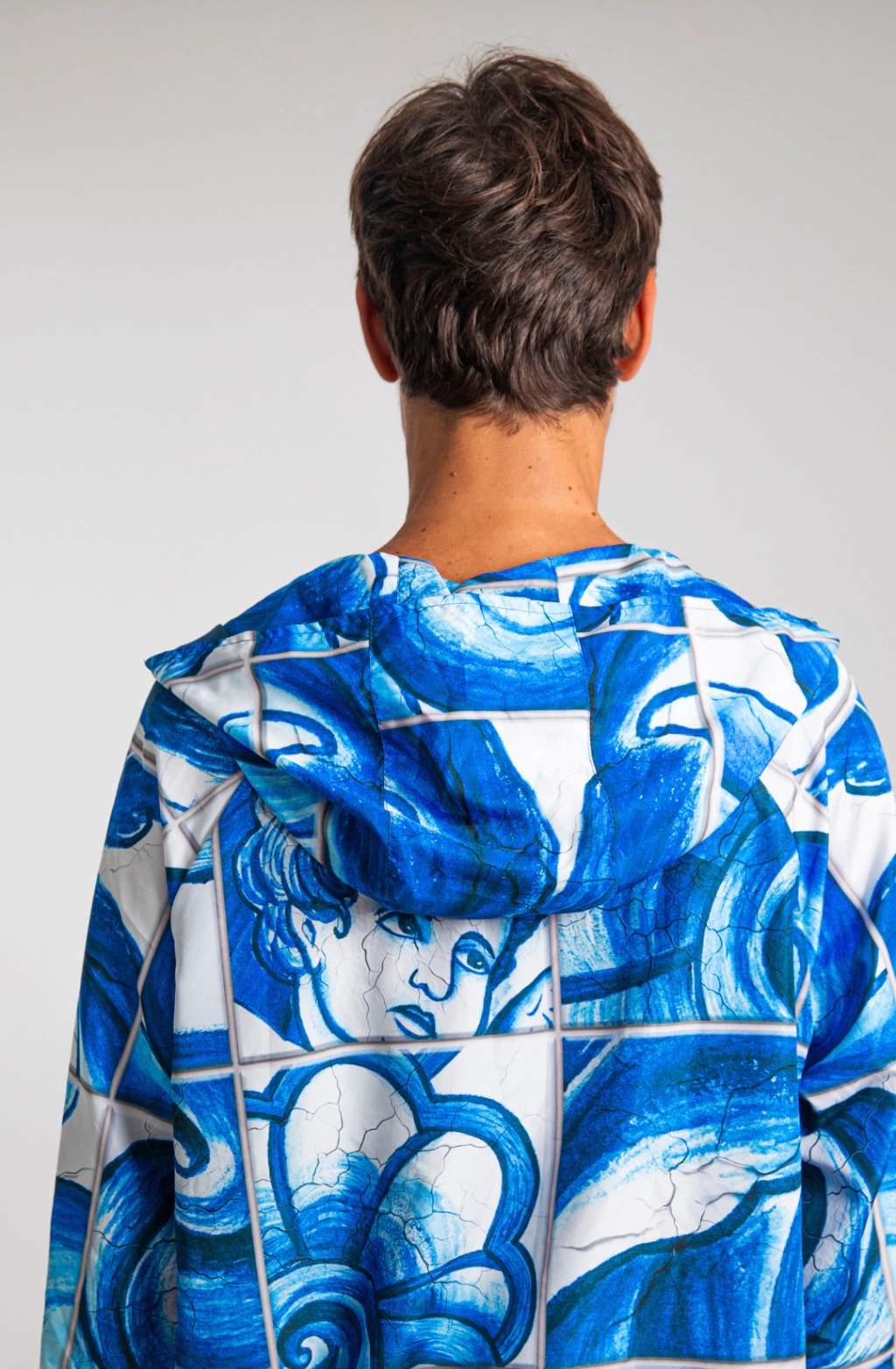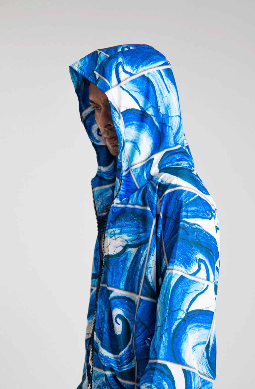 Descubra o conforto e a proteção do Casaco Sete Mares, feito em tecido corta vento 100% poliéster. A estampa Convite ao Celacanto é uma homenagem à duas obras da artista plástica Adriana Varejão, feita em Aquarela pela Designer Marcela Citon. Sua modelagem mais curta com ajuste nas laterais proporciona um caimento perfeito e moderno. Com capuz e forro em tela, garante ventilação e proteção contra o vento, ideal para dias de clima instável. Perfeito para quem busca estilo e funcionalidade em uma peça só.